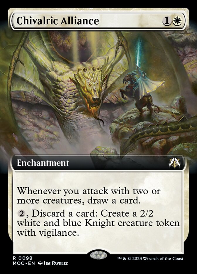 Whenever you attack with two or more creatures, draw a card. {2}, Discard a card: Create a 2/2 white and blue Knight creature token with vigilance.