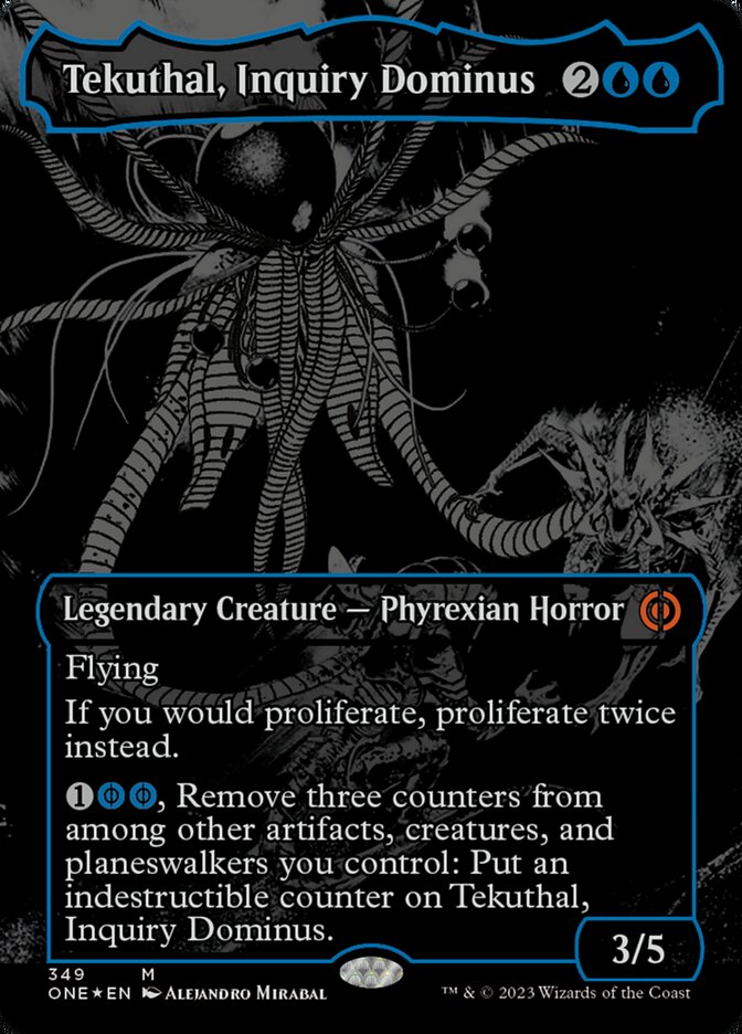 Flying If you would proliferate, proliferate twice instead. {1}{U/P}{U/P}, Remove three counters from among other artifacts, creatures, and planeswalkers you control: Put an indestructible counter on Tekuthal, Inquiry Dominus. ({U/P} can be paid with either {U} or 2 life.)